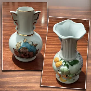 Conjunto de duas jarrinhas decorativas em cerâmica e porcelana. - Uma jarrinha com alças e detalhes dourados, decorada com flores. - Outra jarrinha com relevos de frutas e flores.