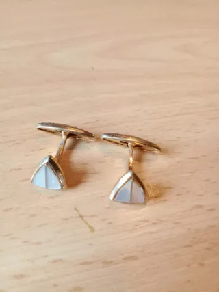 Par de botões de punho com design triangular e detalhes em madrepérola. - Acabamento dourado. - Detalhe em madrepérola. - Design elegante.