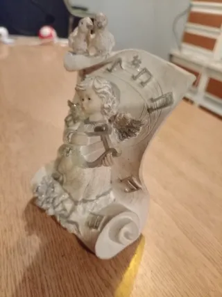 Linda peça decorativa em cerâmica com um anjo tocando um instrumento musical, acompanhado por duas pombas. A peça apresenta detalhes de partitura musical. - Material: Cerâmica - Design: Anjo com instrumento e pombas - Detalhes: Partitura musical