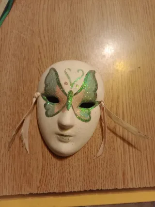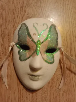Máscara decorativa em cerâmica com design de borboleta. - Detalhes em glitter verde e tons pastel. - Fitas para amarração nas laterais. - Acabamento pintado à mão.