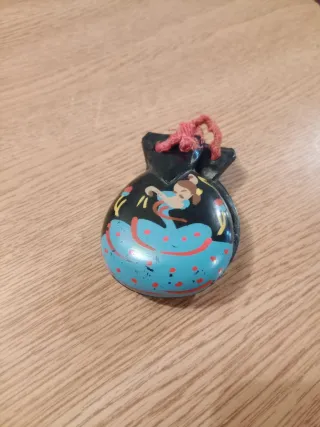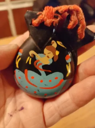 Par de castanholas decoradas com uma figura de bailarina e padrão de bolinhas. - Cor principal preta. - Detalhes em azul e vermelho. - Cordão para prender.