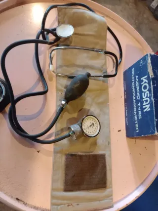 Medidor de pressão arterial tipo aneróide da marca KOSAN, um item vintage. Na caixa original. - Inclui estetoscópio. - Mangueira de borracha preta. - Manômetro com mostrador. - Bolsa de borracha para insuflar.