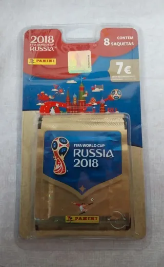 Pack com 8 saquetas de cromos do Mundial 2018 da Panini. - Contém 8 saquetas. - Edição Rússia 2018. - Marca Panini.