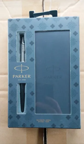 Conjunto de caneta e caderno da marca Parker. - Caneta esferográfica oficial Parker. - Tinta preta - Bloco de notas com capa azul. - Design elegante com o logo da Parker.