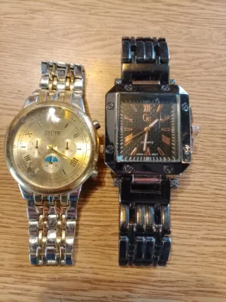 Conjunto de dois relógios de pulso com movimento quartz. O preto está parado talvez precise de pilha ou manutenção. O dourado está a funcionar. - Um relógio com bracelete em metal dourado e prateado e mostrador em tom dourado. - Um relógio com bracelete em metal preto e mostrador quadrado em tom preto com detalhes em dourado.