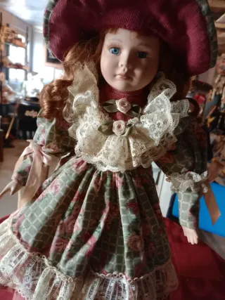 Boneca de porcelana antiga, com um vestido detalhado e um chapéu a condizer. Inclui um suporte para exposição. - Vestido com padrão floral e rendas. - Chapéu largo com acabamento em veludo. - Cabelo longo e ondulado. - Detalhes faciais pintados à mão.
