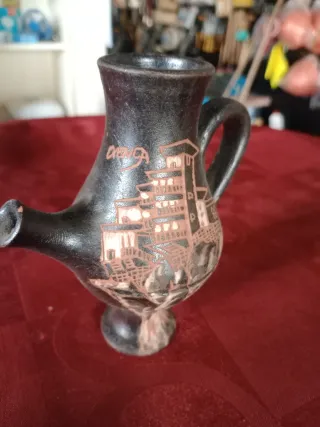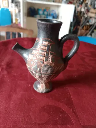 Botijo de cerâmica com um design único e detalhado. Tem pequeno toque na boca como se vê nas fotos pouca coisa . - Material: Cerâmica - Cor: Preto com detalhes em terracota - Design: Relevo de edifícios ou paisagem - Bico para servir - Alça para segurar