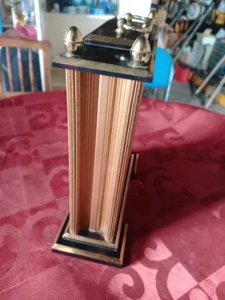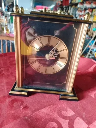 Relógio de mesa com acabamento dourado e detalhes em preto. Possui um design clássico com números romanos. Falta lhe uma bolinha em cima como se vê nas fotos nada que impessa o seu bom funcionamento. - Mecanismo Quartz. - Moldura em metal. - Detalhes em dourado e preto.
