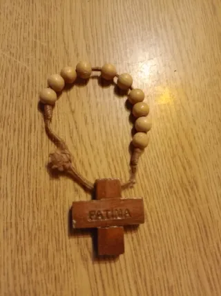 Dezena em madeira com medalha de Nossa Senhora de Fátima. - Contas de madeira. - Cruz de madeira com a inscrição Fátima.