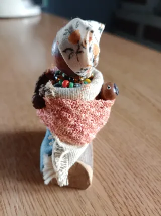 Boneca decorativa feita à mão, com detalhes artesanais. - Corpo em madeira. - Vestuário em tecido e contas coloridas.