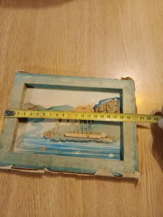 Quadro decorativo com tema asiático, feito em cortiça. - Representação de paisagem com casa. - Detalhes em madeira e relevo.