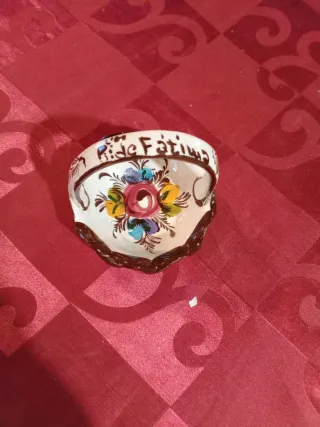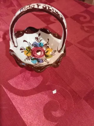 Cestinha decorativa em cerâmica, pintada à mão com um padrão floral. - Detalhe de flores coloridas. - Escrita Ride Fátima na borda.