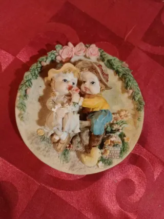Lindo ornamento decorativo com um casal de crianças. - Detalhes em relevo. - Tema romântico com flores e um pintinho. - Ideal para colecionadores ou como presente.