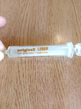 Seringa antiga da marca Originali Leber, feita de vidro Ruhr com resistência a 200°C. - Fabricada em Itália. - Material: Vidro Ruhr. - Resistência a altas temperaturas (200°C).