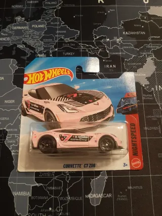 Miniatura Hot Wheels do Corvette C7 Z06 na cor rosa. - Detalhes em preto e estrelas. - Pneus pretos. - Escala 1:64.