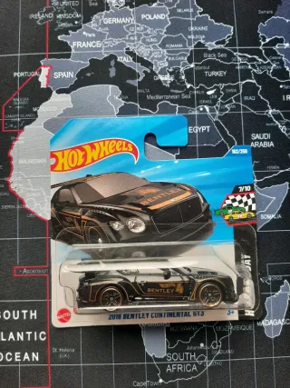 Miniatura Hot Wheels do Bentley Continental GT3 de 2018. - Cor preta com detalhes dourados. - Escala 1:64. - Parte da coleção 2018.