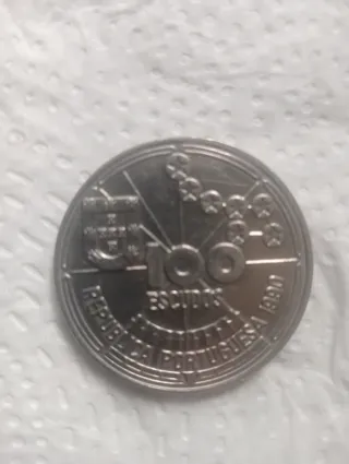 Moeda de coleção da República Portuguesa. - Valor: 100 Escudos - Ano: 1990 - Design com o escudo nacional e elementos gráficos.