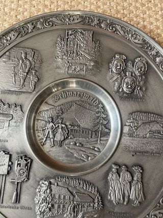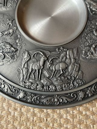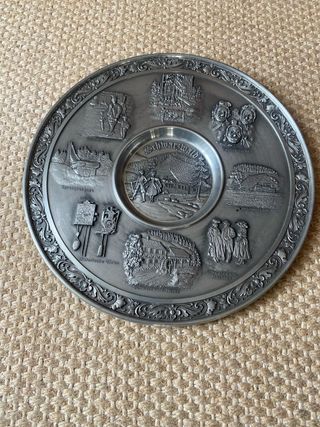 Prato decorativo em estanho com motivos vintage. - Design detalhado com cenas. - Borda ornamentada. Dimensões 22,5 X 22,5 Tenho outro diferente nos meus anúncios. Desci o valor não é negociável. Veja fotografias por favor