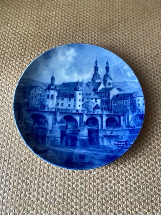 Prato decorativo em porcelana com um design inspirado em Berlim. A peça apresenta uma cena de ponte e edifícios históricos. - Design em azul e branco. - Detalhes da cidade de Koblenz. Dimensões 24,5 X 24,5 Veja fotografias por favor