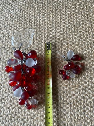 Conjunto de cachos de uvas decorativos em vidro soprado, com um toque vintage dos anos 60. Perfeitos para adicionar um charme especial à sua decoração. - Cachos de uvas em vidro soprado. - Detalhes em vermelho / bordeuax e branco. - Folha decorativa em vidro. - Fio de metal - Anos 60 Cacho grande = 25€ Cacho pequeno = 20€ Tenho de editar valor consoante o que escolher Não sei se é vidro Murano Estado impecável,como novo,veja fotografias por favor