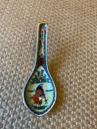 Colher de porcelana com decoração Briga de Galos de Macau. Uma peça delicada e com um design oriental. - Motivo de galos em combate. - Detalhes em dourado na borda e no cabo. - Acabamento em porcelana pintada à mão. Veja fotografias por favor