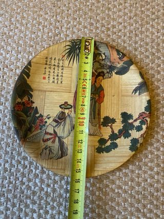 Prato decorativo vintage em bambu com um belo desenho oriental de figuras e paisagens. - Material: Bambu - Design: Figuras orientais - Estilo: Vintage Desci o valor,não é negociável. Veja fotografias por favor