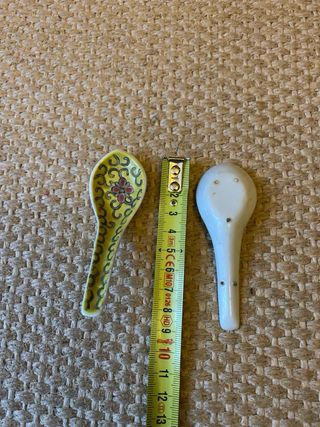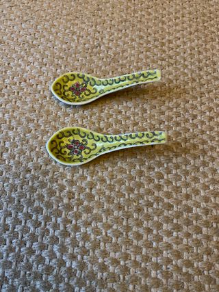 Par de colheres de porcelana com um design floral delicado. - Cor base amarela. - Detalhes florais em vermelho e preto. - Estilo vintage japonês. - Miniatura de colher Dimensões 9 Cm de altura Conjunto de 2 colheres = 8€ Cada = 5€ Tenho de editar o valor final consoante a sua escolha. Veja fotografias por favor e a louça japonesa nos meus anúncios.