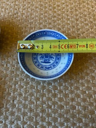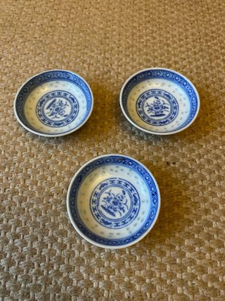 Conjunto de três taças em miniatura com o clássico padrão de bago de arroz. - Design vintage. - Padrão azul e branco. - Ideal para colecionadores ou decoração. Dimensões: 6,50 X 6,50 Conjunto de 3 taças = 8€ Desci o valor nao é negociável Veja fotografias por favor