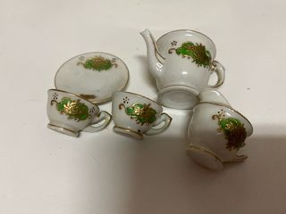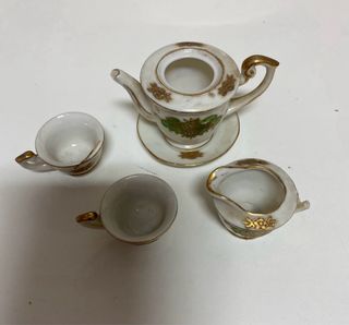 Conjunto de serviço em miniatura de porcelana com um design floral verde e friso dourado. - Inclui bule, açucareiro, pires e duas chávenas. - Peça decorativa delicada. - Bule sem tampa - Asa da jarra partido,veja circulo azul Conjunto de 5 peças = 6€ Desci o valor não é negociável. Veja fotografias por favor