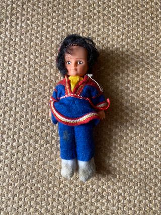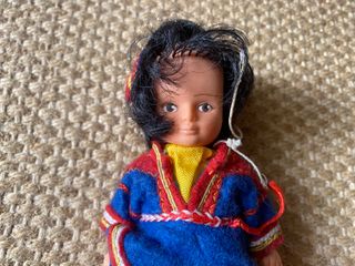 Boneco antigo com roupa tradicional. - Roupa azul com detalhes vermelhos e amarelos. - Cabelo preto. - Rosto detalhado. Veja fotografias,por favor