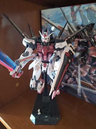 Modelo completo do Gundam Strike Rouge, MG (Master Grade). Inclui todas as peças e acessórios originais, vai com a caixa original onde ainda estão todos os sprues. A única coisa que foi colada na figura foram as antenas pois estavam sempre a cair. A figura foi apenas montada e desde então esteve numa prateleira em exposição.