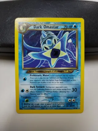 Carta Pokémon Dark Omastar #19 da coleção Neo Destiny. - Dark Omastar - HP 70 - Stage 2 Pokémon - Ataques: Prehistoric Water, Dark Tentacle - Fraqueza: Planta - Resistência: Lutador - Custo de Retirada: 2 - Ilustrador: Tomokazu Komiya - Número da carta: 19/105