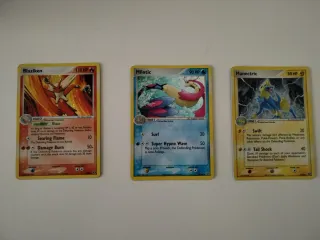 Conjunto de 3 cartas Pokémon, Holo rare, set ex emerald de 2005. - Blaziken (Stage 2) - 110 HP - Milotic (Stage 1) - 90 HP - Manectric (Stage 1) - 80 HP