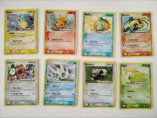 Conjunto de cartas Pokémon da expansão Emerald. Inclui cartas de Minun, Torchic, Mudkip, Ninetales, Loudred, Wailmer, Zigzagoon e Gulpin. - Cartas Pokémon. - Expansão Emerald. - Inclui 8 cartas diferentes.
