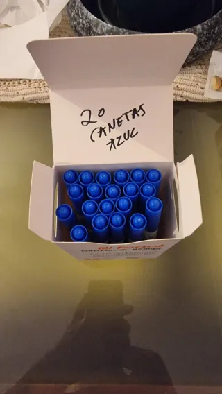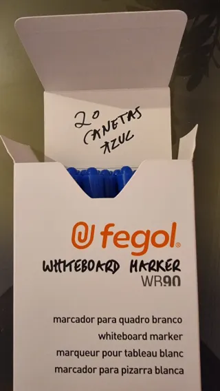 Conjunto de 20 canetas de quadro branco na cor azul. - Ideal para uso em quadros brancos. - Cor azul. Conjunto de 20 canetas de quadro branco da marca Fegol, modelo WR90, na cor Azul. - Cor: Azul - Quantidade: 20 unidades - Marca: Fegol - Modelo: WR90 CARACTERÍSTICAS: manter na horizontal | • ponta redonda • suave - apagável • para quadro branco • tampa ventilada • tinta apagável