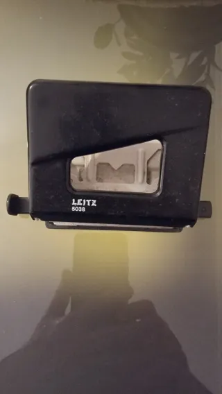 Furador de papel Leitz 5038. É um furador de dois furos, compacto e robusto, projetado para uso diário em escritórios ou em casa. Tem capacidade para furar até 16 folhas de papel de 80 g/m² de uma só vez. Possui uma área de pega ergonómica e punções afiadas para reduzir o esforço de perfuração. Inclui uma guia de papel com marcações de formato claras e uma caixa de resíduos articulada e fácil de esvaziar.