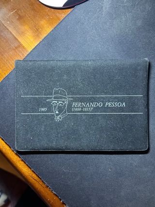 Carteira de moedas comemorativa de Fernando Pessoa, edição de 1985. - Design com retrato estilizado de Fernando Pessoa. - Ano de edição: 1985. - Detalhes em branco sobre fundo escuro.