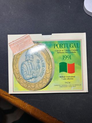 Conjunto de 7 moedas correntes portuguesas de 1991, em condição brilhante não circulada. - Coleção de moedas de Portugal. - Ano de emissão: 1991. - Inclui 7 moedas. - Apresenta a imagem de Garcia de Orta. - Embalagem original da Portuguese State Mint (INCM). carteira com alguns danos conforme nas fotos
