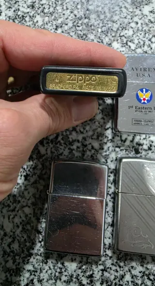 Conjunto de quatro isqueiros Zippo. - Isqueiro preto com cruz dourada. - Isqueiro prateado com AVIREX U.S.A. 1st Eastern US. - Isqueiro prateado liso. - Isqueiro prateado com padrão riscado.