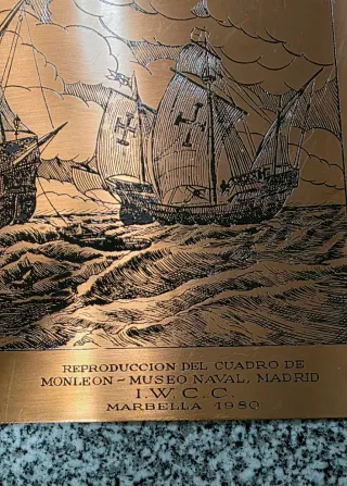 Placa de cobre gravada com a cena do Descobrimento da América. - Representa as caravelas de Cristóvão Colombo. - Ano 1492. - Reprodução do quadro de Monleón. - Museu Naval, Madrid. - Marbella 1980.