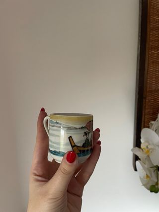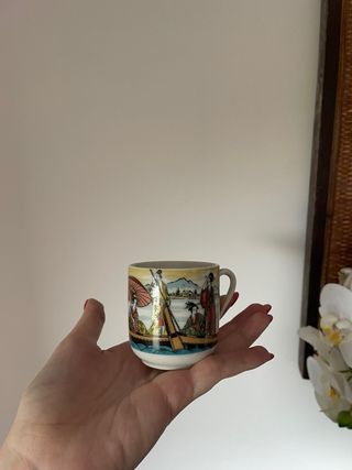 Chávena de café com um bonito padrão. - Design com cena oriental. - Detalhes em dourado e cores vibrantes. - Alça para segurar.