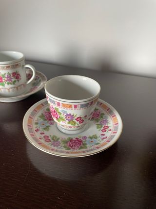 Conjunto de três chávenas de café com os seus respetivos pires, com um delicado padrão floral. - Design floral colorido. - Inclui três chávenas. - Inclui três pires.