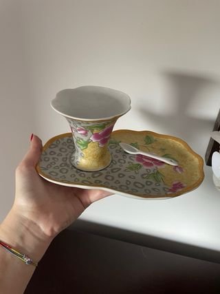 Conjunto de chávena de café com pires, com um design oriental vibrante. - Padrão com pássaros e flores. - Borda dourada na chávena e no pires. - Pires com formato octogonal.