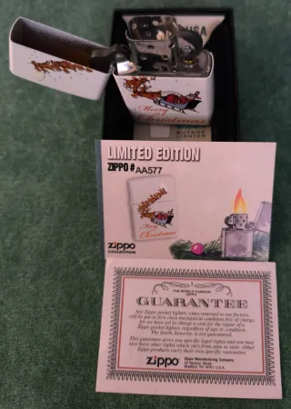Isqueiro Zippo de edição limitada com tema de Natal. - Design Merry Christmas com trenó e renas. - Número de série: #AA577. - Inclui folheto de garantia Zippo.