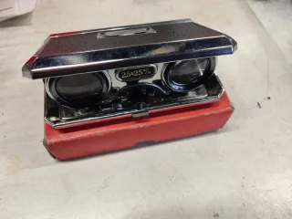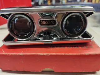 Óculos de ópera compactos e elegantes, perfeitos para eventos e espetáculos. - Design clássico em metal cromado. - Lentes com ampliação 2.5x. - Abertura da lente de 25mm.