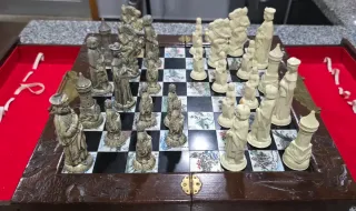 Conjunto de xadrez antigo com peças de inspiração asiática. - Peças esculpidas em material de alta qualidade. - Tabuleiro com design oriental. - Peças com detalhes intrincados.
