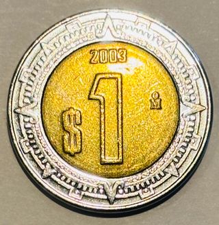 Año de emisión 2003 Valor facial 1 peso Composición bimetálica centro de bronce aluminio 92% cobre 6% aluminio 2% níquel anillo de acero inoxidable Peso 3.95 gramos Diámetro 21 mm Grosor 1.6 mm Canto liso Ceca casa de moneda de méxico Anverso escudo nacional de méxico con el águila devorando una serpiente sobre un nopal rodeado por la leyenda estados unidos mexicanos Reverso símbolo de peso seguido del número 1 con el año 2003 encima y la marca de ceca mo a la derecha en el anillo exterior una estilización del anillo del resplandor de la piedra de sol. Circulada Requiere limpieza #1694