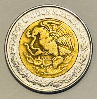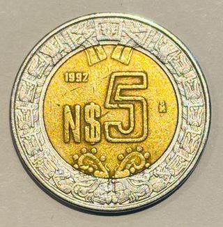 Año de emisión 1992 Valor facial 5 pesos Composición bimetálica centro de bronce aluminio 92% cobre 6% aluminio 2% níquel anillo de acero inoxidable Peso total 7.07 gramos Diámetro 25.5 mm Grosor 1.8 mm Canto liso Ceca casa de moneda de méxico Anverso escudo nacional de méxico con el águila devorando una serpiente sobre un nopal rodeado por la leyenda estados unidos mexicanos Reverso símbolo de peso seguido del número 5 con el año 1992 encima y la marca de ceca mo a la derecha en el anillo exterior una estilización del anillo de las serpientes de la piedra del sol Circulada Requiere limpieza #1696