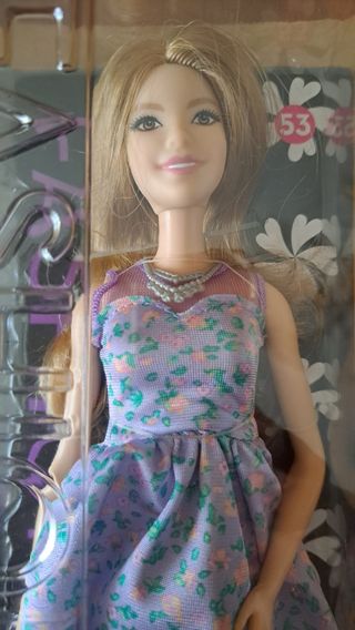 Barbie Fashionista 53 com cabelo loiro. - Vestido lilás com estampa floral. - Colar prateado.