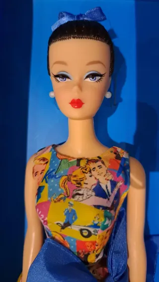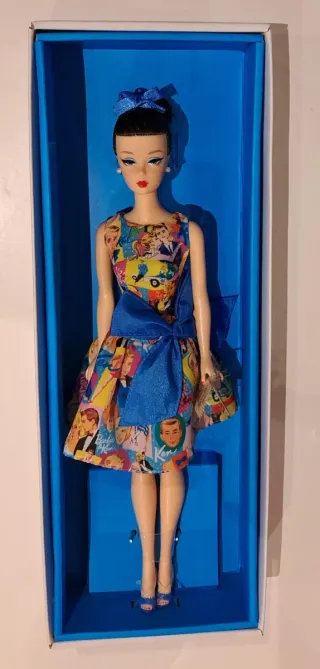 Boneca Barbie Signature Birthday Beau com um vestido vibrante e estampado. - Vestido com estampas de Barbie e Ken. - Laço azul no vestido. - Sapatos azuis. - Cabelo preto preso com laço azul.
